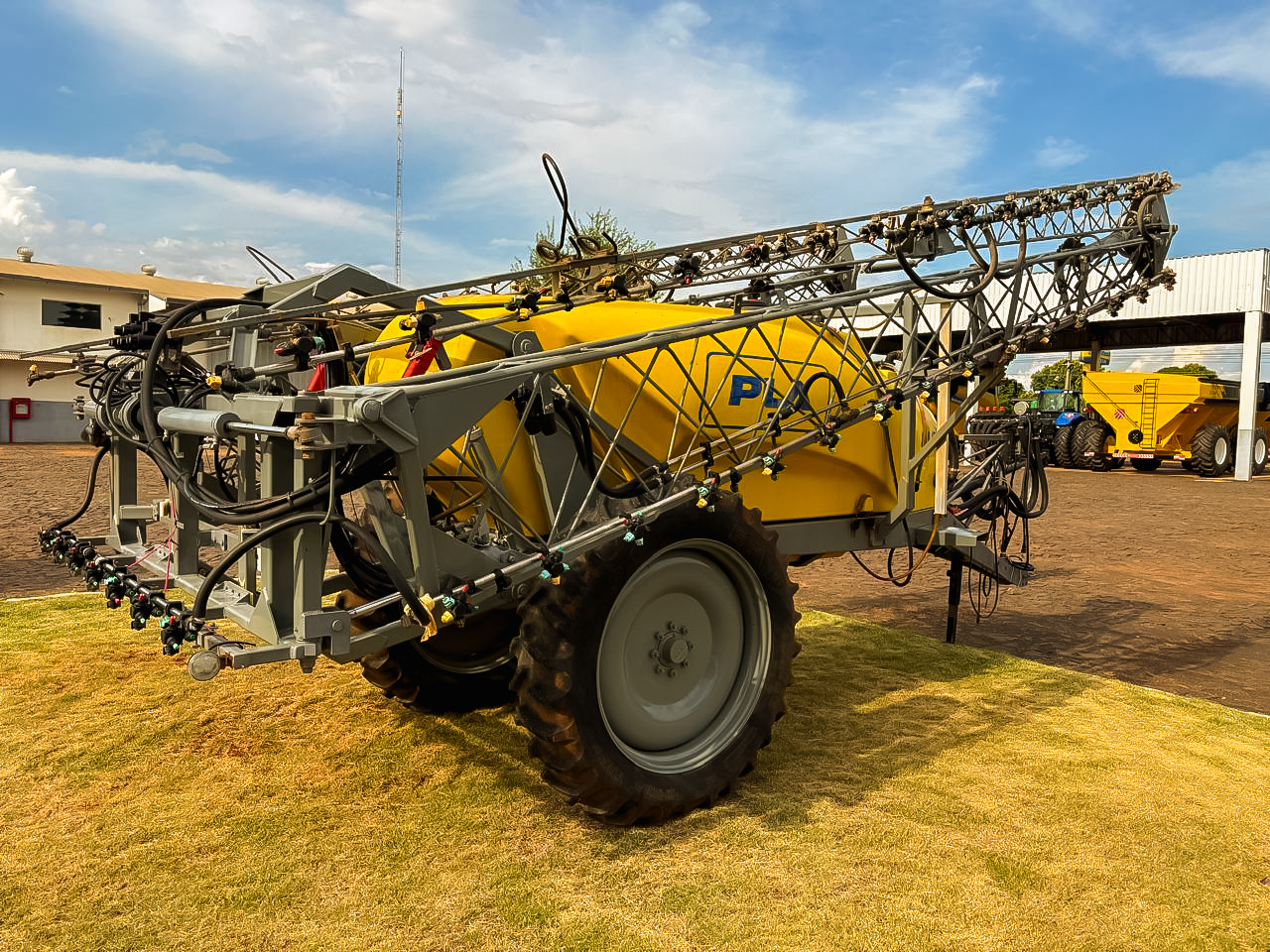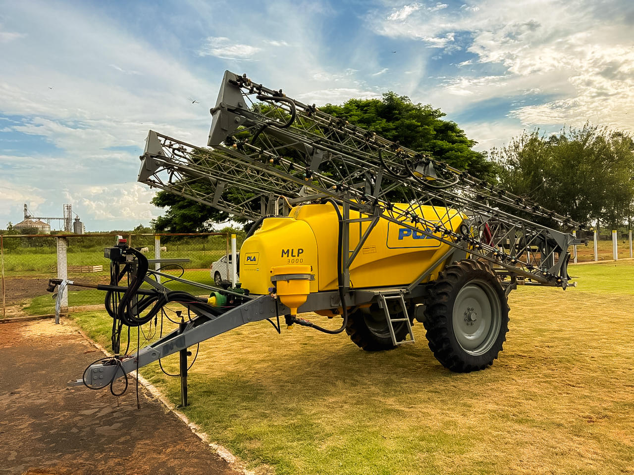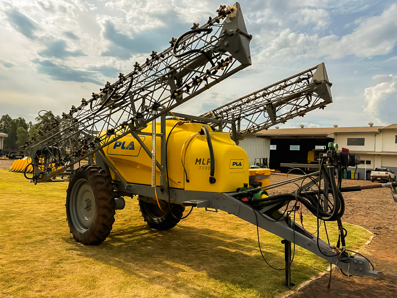 Pulverizadora de arrastre PLA MLP 3000, equipada con tanque de 3.000 litros y barras de 24,5 metros de ancho de trabajo. Cuenta con bomba Udor de membranas, líneas de pulverización en acero inoxidable y apertura hidráulica de barras con control desde el tractor.